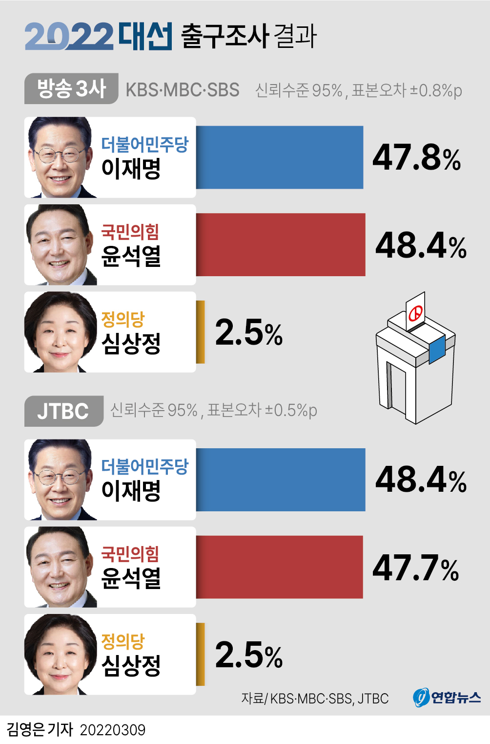 이때문에 JTBC 예측조사 결과를 받아써먹을지도 실제로 연합뉴스TV에서 두세 번 가량 JTBC 결과를 속보로 내보냈다2021년 4월 7일에 치뤄진 2021년 재보궐선거 출구조사도 코로나19 자가격리자 투표 시간을 고려해 투표 마감 15분 후인 오후 8시 15분 공개되었다.